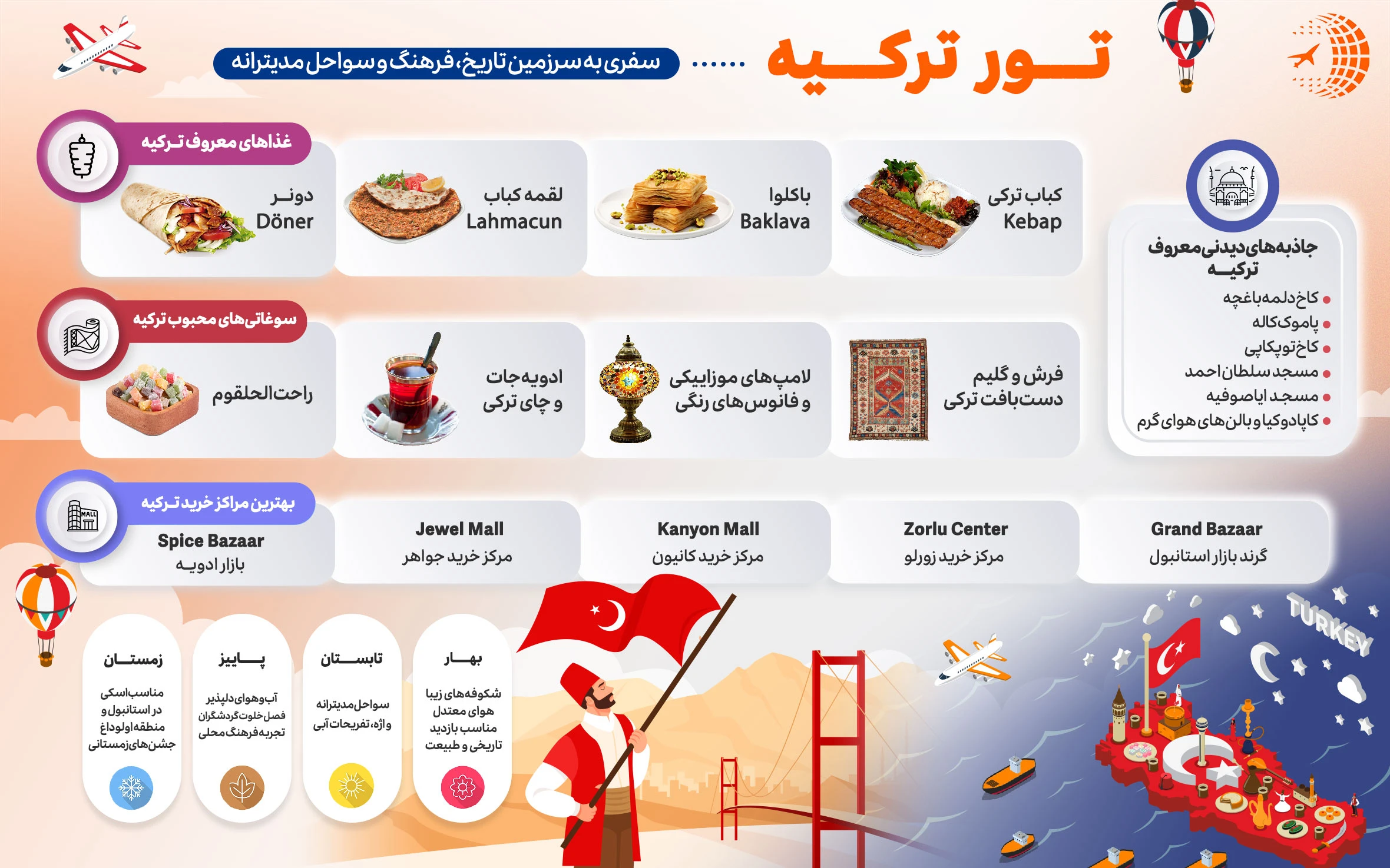 تور ترکیه گزینه ای عالی برای افرادی است که می خواهند یک سفر جذاب، کم هزینه و متفاوت را تجربه کنند. ترکیه کشوری است که با فرهنگ غنی، طبیعت متنوع و تاریخ پربار خود هر ساله میزبان میلیون ها گردشگر از سراسر جهان است. بسیاری از گردشگران با هدف قدم زدن در خیابان های شلوغ و مدرن استانبول، آفتاب گرفتن در ساحل آرام آنتالیا و بازدید از شهرهای تاریخی مانند ازمیر و کوش آداسی به این کشور سفر می کنند. فرقی نمی کند که با چه هدفی به ترکیه سفر می کنید، در هر صورت با انتخاب تور ترکیه می توانید یک سفر فراموش نشدنی را تجربه کنید.