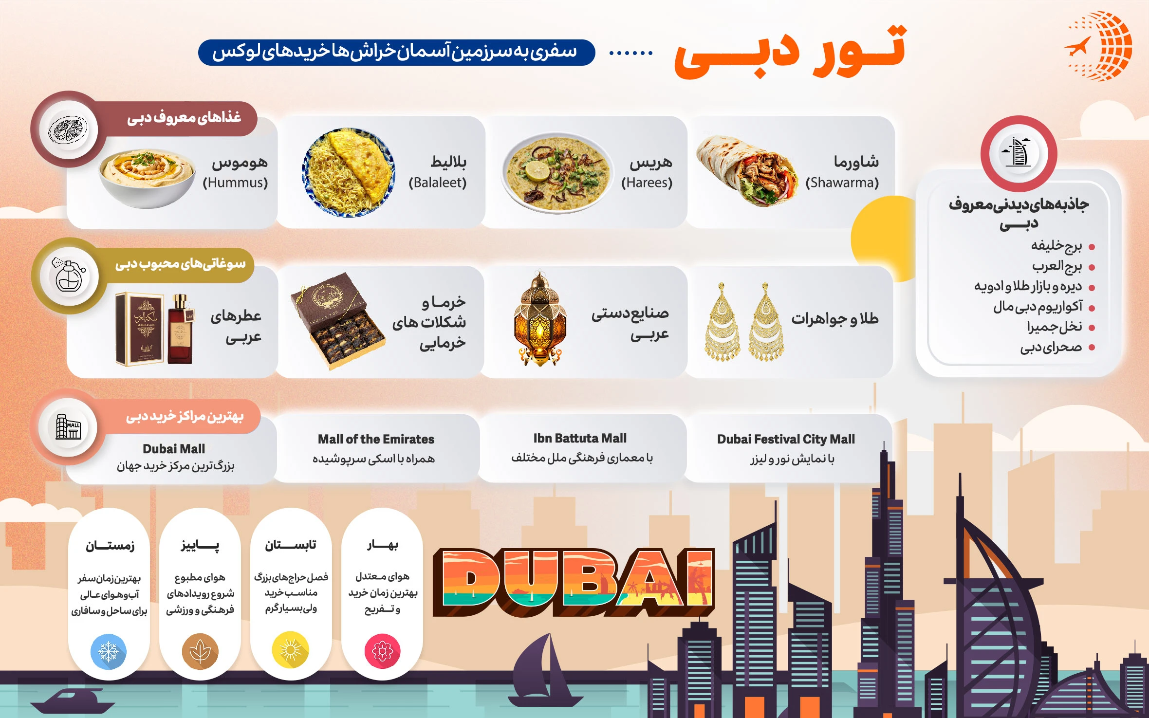 تور دبی یک فرصت عالی برای گردشگران است تا از تماشای معماری های مدرن و قدم زدن در مراکز خرید و سواحل زیبای این شهر لذت ببرند و با فرهنگ عربی سنتی این منطقه آشنا شوند.