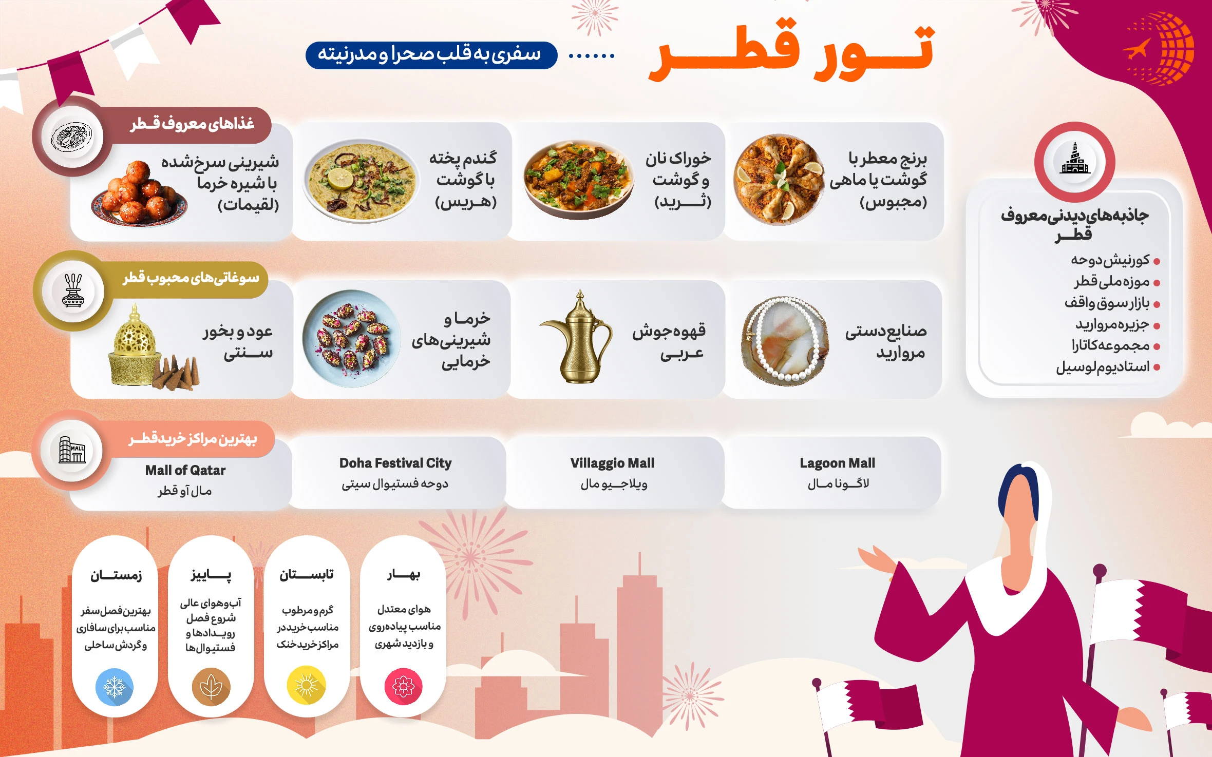 کشور قطر با زیرساخت های مدرن، امنیت بالا و تنوع فرهنگی، خود را به عنوان یکی از مقاصد رو به رشد برای سفرهای توریستی در منطقه معرفی کرده است. برای تجربه یک سفر فراموش نشدنی به قطر، لازم است برنامه ریزی دقیق داشته باشید و یک تور مناسب را انتخاب کنید.